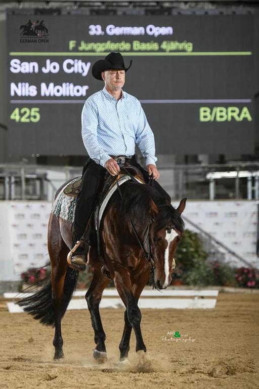 San Jo City hat bereits im ersten Showjahr bewiesen, dass er alle guten Eigenschaften seines Vaters geerbt hat. Er ist absolut brav und lieb, ein enoromes Stopptalent und ist super leicht zu reiten.